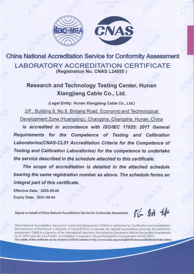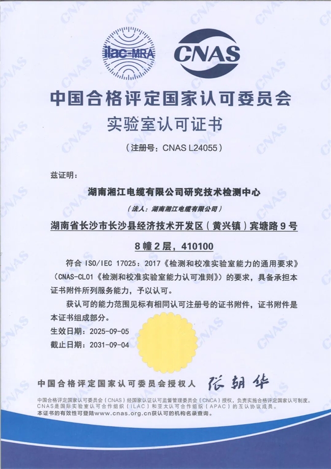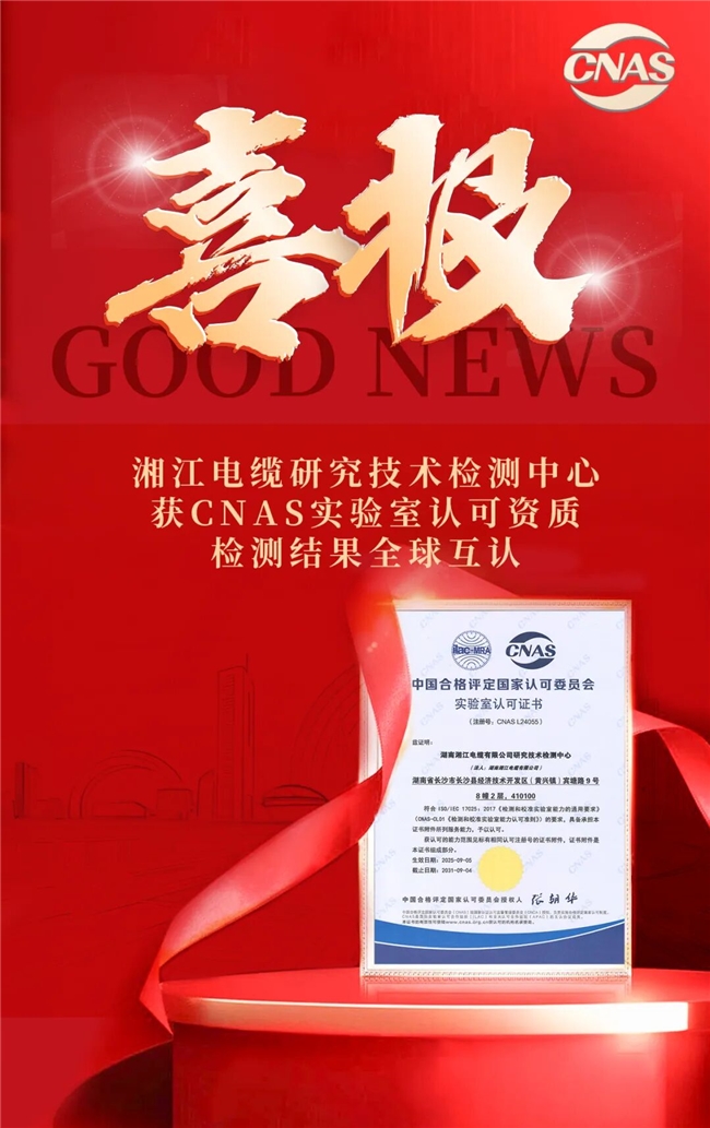 近日,湘江电缆迎来一个里程碑式的重要时刻——公司“研究技术检测中心”正式通过中国合格评定国家认可委员会(CNAS)的评审,成功获得CNAS国家实验室认可证书!(注册号:CNAS L24055)